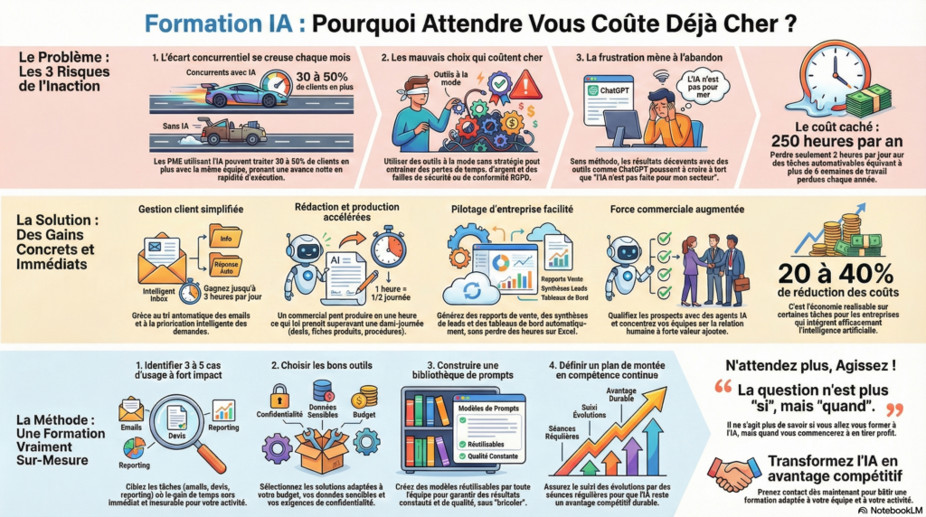 Ne pas se former à l’IA aujourd’hui, ce n’est pas « attendre de voir » : c’est laisser vos concurrents apprendre pendant que vous gardez les contraintes sans les gains. Les analyses récentes montrent que les PME qui intègrent l’IA dans leurs processus prennent une avance nette en rapidité d’exécution et peuvent traiter 30 à 50% de clients supplémentaires avec la même équipe.
